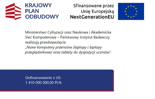 Zadanie dofinansowane jest ze środków Unii Europejskiej w ramach Krajowego Planu Odbudowy i Zwiększania Odporności w łącznej kwocie 1 410 000 000,00 zł, przeznaczonej na realizację projektu przez wszystkich beneficjentów na terenie całego kraju.